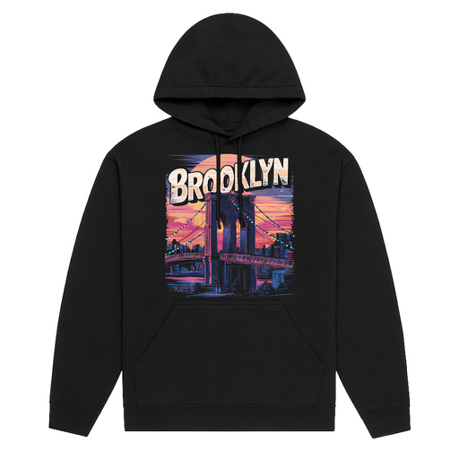 Capture the mesmerizing beauty of a Brooklyn sunset with our custom graphic hoodie, featuring the Brooklyn Bridge surrounded by NYC architecture an...