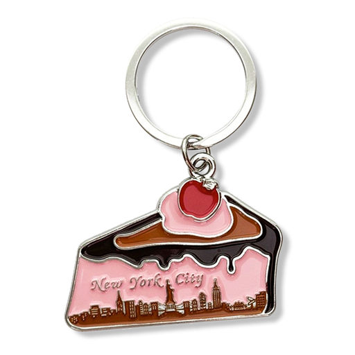 A sweet slice of NYC to-go. This playful enamel keychain features a strawberry cheesecake topped with whipped cream and a cherry, set above a pink-...