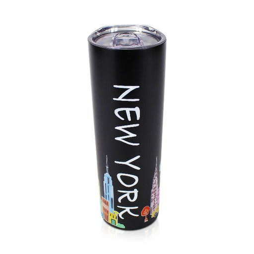 This stainless steel coffee and hot or cold beverage bottle incorporates a Custom Sketch of a mural of Manhattan monuments onto a smooth, matte fin...