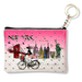 This vibrant zip pouch blends dreamy pink tones with the energy of the New York City skyline. A whimsical cyclist rides past iconic landmarks like the Brooklyn Bridge and Statue of Liberty, surrounded by delicate hearts and shimmering stone studs.