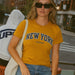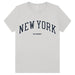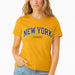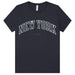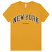 This version features arched “NEW YORK” block lettering in bold navy with a crisp white outline — a classic collegiate-inspired graphic with timeless appeal. Offered in Gold, Navy, and Silver.