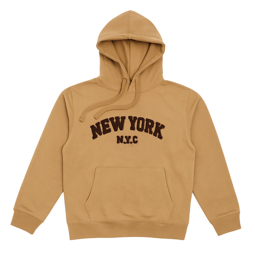 Elevate your everyday style with an ultra-soft hoodie featuring a towel-textured chenille appliqué. “NEW YORK” arches across the chest with “N.Y.C...