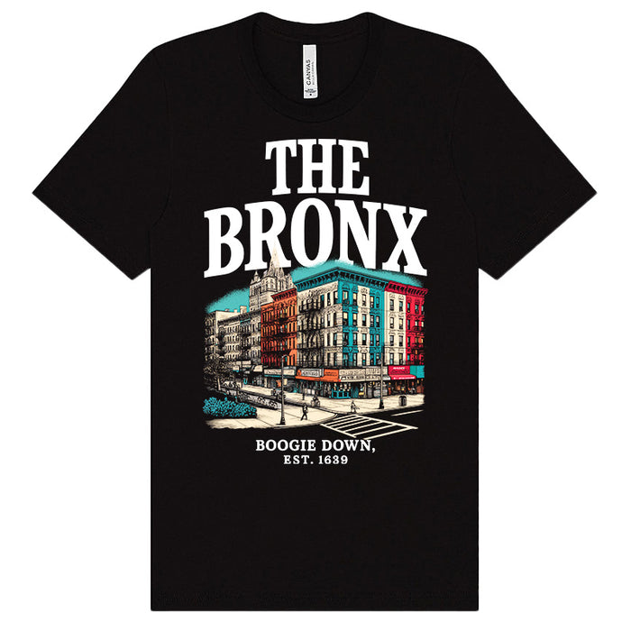 Repping the borough where hip hop was born and culture never sleeps, this black tee puts The Bronx front and center. Featuring a vivid illustration of a Bronx city block—classic architecture, corner stores, and that unmistakable Boogie Down energy—this shirt is stamped with bold varsity-style THE BRONX lettering and the phrase Boogie Down, EST. 1639 underneath.