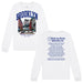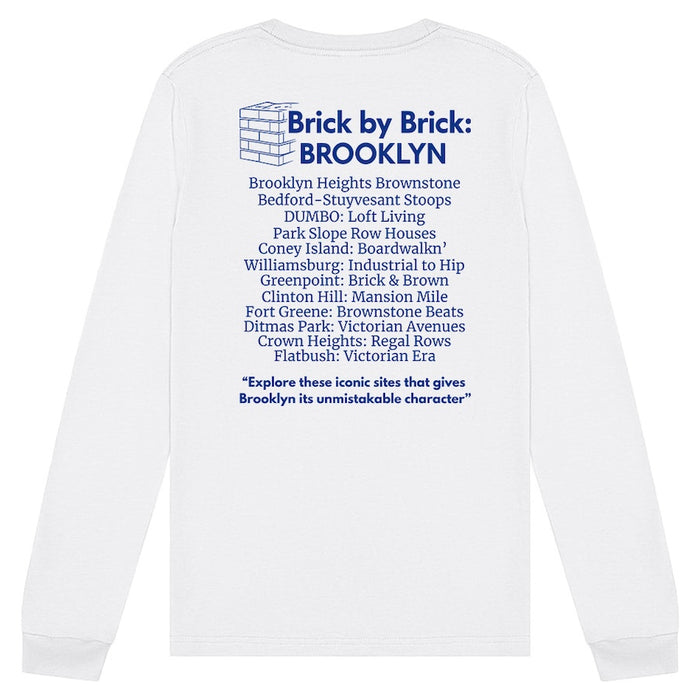 Part of our “Brick by Brick” NYC Boroughs Collection, this crisp white long sleeve brings Brooklyn to life through the DUMBO lens — with a hand-drawn street view leading up to the Manhattan Bridge, framed by bold BROOKLYN arch lettering and “Kings County, EST. 1634.” Flip to the back for a borough deep dive featuring architectural and neighborhood callouts that define the heart of BK.