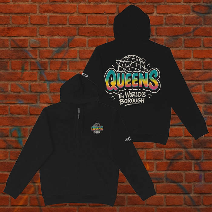 Diverse, vibrant, and proudly global—this heavyweight zip-up hoodie salutes Queens, The World’s Borough, in true street-style fashion. The back explodes with a bright bubble-graffiti “QUEENS” graphic, drenched in a rainbow-fade fill and outlined bold for maximum presence. Framed by the legendary Unisphere and hand-tagged with “The World’s Borough,” this design is a nod to the melting pot energy that makes Queens unlike anywhere else.