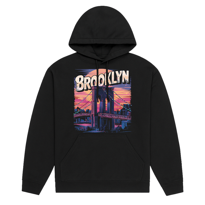 Capture the mesmerizing beauty of a Brooklyn sunset with our custom graphic hoodie, featuring the Brooklyn Bridge surrounded by NYC architecture and skyline. The sunset creates a stunning purple and orange color scheme, evoking a sketch style paint vibe. "BROOKLYN" is boldly written at the top, adding to the visual appeal. Made from 50/50 Cotton-Polyester Heavy blend, this all-black hoodie offers both durability and comfort. Available in unisex sizes Small to 4XL, it's perfect for those who appreciate the artistic and iconic sights of New York City.