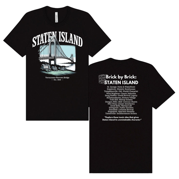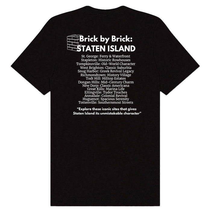 The back of the shirt dives into the island’s deep-rooted neighborhoods and architectural charm. “Brick by Brick: STATEN ISLAND” leads into a breakdown of the borough’s unique pockets—from the ferry-front heritage of St. George to the Greek Revival touches of Snug Harbor, the mid-century flair of Dongan Hills, and beachside serenity of Tottenville. Each stop showcases a different side of Staten Island—historic, quiet, proud, and full of local soul.